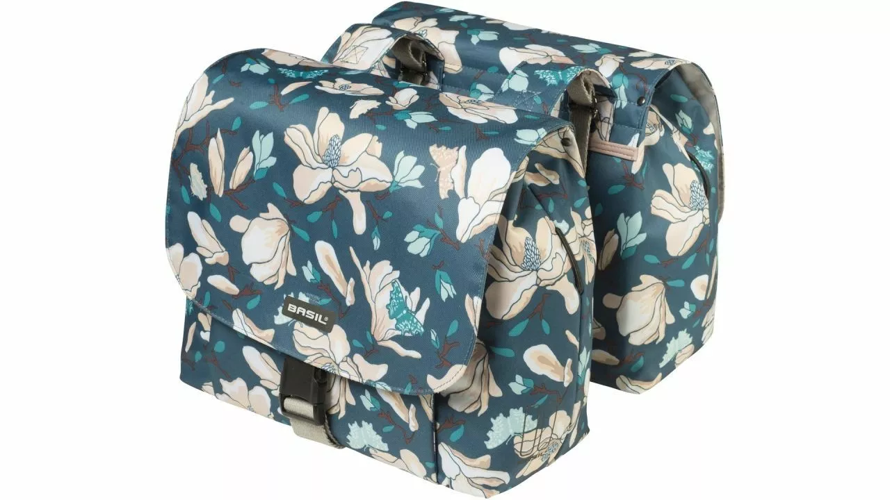 Die BASIL Magnolia S ist eine doppelte Fahrradtasche, die man am Gepäckträger eines Damen- oder Kinderfahrrads befestigt. Die Tasche fällt auf Grund ihres stilvollen Prints mit Blumen wunderbar auf. <br>Die Fahrradtasche besteht aus wasserabweisendem Polyester. Dies ist ideal, wenn man sich einmal in einem Regenschauer befindet. Dennoch ist es empfehlenswert die Taschen vom Fahrrad abzunehmen, falls Sie Ihr Fahrrad nicht an einem trockenen Ort abstellen können. <br><br>Schwingen Sie sich regelmäßig aufs Fahrrad auf dem Weg zur Arbeit, dem Bahnhof oder zur Schule? Dann ist diese Fahrradtasche ein unentbehrliches Accessoire. Dank eines Inhalts von 25 l lassen sich darin diverse Sachen zur Schule oder Arbeit mitnehmen. Selbstverständlich bietet sich die doppelte Fahrradtasche auch gut für das Erledigen von Einkäufen an. <br>Die Tasche verfügt über eine Innenfütterung und lässt sich leicht mithilfe eines Falt- und Klickverschlusses schließen. Die 2 Bänder kann man prima in Kombination mit einer Federklappe oder Gepäckträger-Spanngurten nutzen. Auf alle Fälle sind sie dafür nicht im Weg.