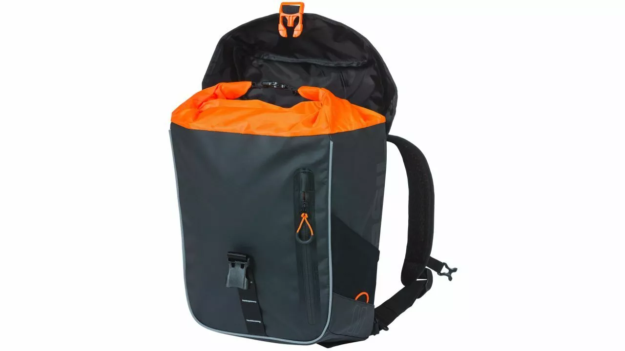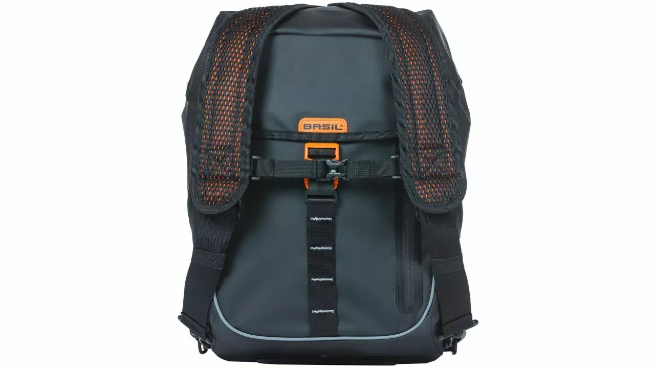 Rucksack oder Fahrradtasche du hast die Wahl! Der Fahrradrucksack Miles von BASIL kann nämlich beides. Zum einen lässt er sich bequem auf dem Rücken tragen. Zum anderen ist er mit dem praktischen Hook-on-System ausgestattet, und lässt sich daher kinderleicht am Gepäckträger montieren.<br><br>Der Rucksack ist aus wasserdichtem Tarpaulin gefertigt und hält somit auch kräftigen Regenschauern stand. Der Rollverschluss mit Druckknopf unterstützt dabei zusätzlich. Wenn dir die zwei Tragevarianten nicht reichen, kannst du die Tasche mit dem abnehmbaren Gurt locker über die Schulter hängen. Oder du nimmst sie einfach am Tragegriff in die Hand. <br><br>Die Tasche ist mit Reflexapplikationen ausgestattet, sodass man dich im Straßenverkehr besser sieht. Kleine Schlaufen bieten die Möglichkeit, weitere LED-Leuchten anzuklemmen. Optional gibt es den Miles mit batteriebetriebenen LED-Leuchtstreifen von BASILs Nordlicht Technology.