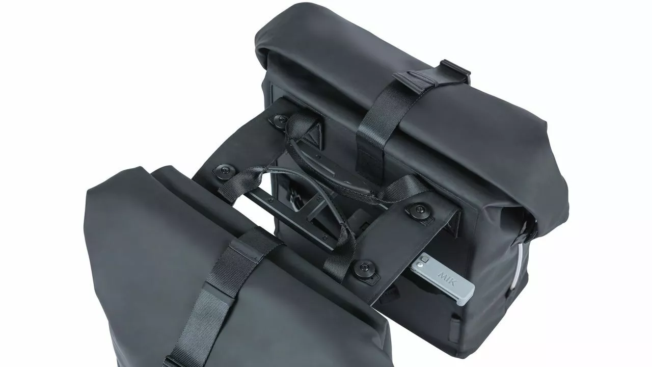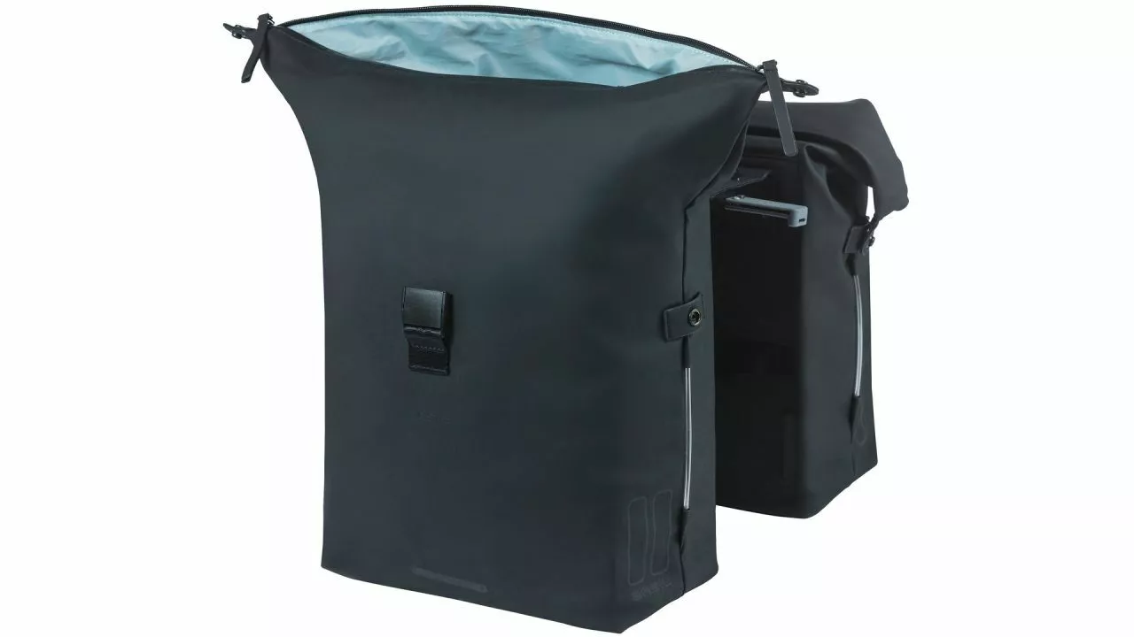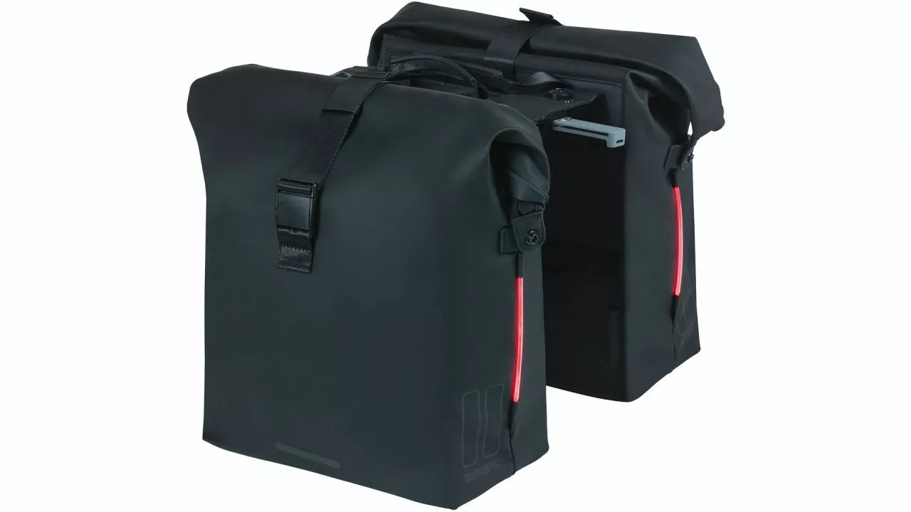Etwas grundsätzlich Verschiedenes vermitteln die Wörter SoHo und Nordlicht. Während SoHo der Name des wohl aufregendsten Viertel Manhattans ist, erinnert Nordlicht viel mehr an das ruhige Skandinavien. Geeignet für beide Reiseziele ist diese Fahrrad-Doppeltasche von BASIL in jedem Fall. <br><br>Schon allein wegen ihres cleanen und minimalistischen Stils überzeugt diese Tasche auf ganzer Linie. Fasst du die Tasche an, merkst du, dass sie sich sehr weich anfühlt. Das liegt daran, dass sie aus mattem PU-Material gefertigt und somit wasserdicht ist (IPX3). <br><br>Mit 41 Litern verfügt die Doppeltasche über eine Menge Stauraum, um sich mit einem umfangreichen Survival-Kit für eine Radreise in die abgelegensten Gegenden Skandinaviens auszustatten. Verschlossen wird sie mit einem Rolltop-Verschluss, der mit Druckknöpfen an den Seiten befestigt wird, und einem zusätzlichen Schnappverschluss. <br><br>Für maximale Sicherheit ist die Tasche mit der Nordlicht Technology ausgestattet. Das heißt, die Taschen sind mit integrierten LED-Streifen ausgestattet (Batterien sind separat erhältlich). Dieses Extra ersetzt nicht die gesetzlich vorgeschriebene Fahrradbeleuchtung. <br><br>Dank der vormontierten MIK-Adapterplatte ist die Doppeltasche einfach am Gepäckträger zu befestigen. Die Platte lässt sich in MIK-Profile oder die MIK-Trägerplatte einklicken.