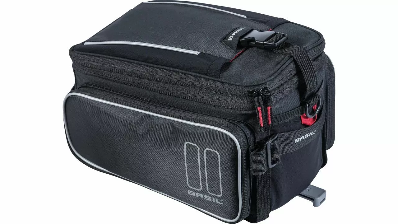 Bei der BASIL Sport Design MIK handelt es sich um eine geräumige Tasche für den Gepäckträger mit stattlichen 7 bis 15 l Volumen. An der Tasche sind diverse Fächer integriert, die bei Bedarf per Reißverschluss aufgeklappt werden können. Somit stehen reichlich Unterbringungs-Möglichkeiten für Ihre Sachen zur Verfügung. <br><br>Mit der vormontierten MIK-Adapterplatte eignet sich die Tasche für MIK-Gepäckträger oder die MIK-Trägerplatte. So lässt sich die Sport Design einfach auf dem Gepäckträger einklicken. An deren abnehmbaren Schulterriemen kann man die Tasche über die Schulter hängen und bequem überallhin mitnehmen.<br>/> <br>/> Das Topcase aus Polyester verleiht der Tasche ihren progressiven Look. Einen trendigen Kontrast dazu bildet das Innenfutter, entweder in Rot oder in Blau. <br>Mit dem MIK-System ist die Tasche für fast alle Fahrräder, auch E-Bikes, geeignet.<br>Die Gepäckträgertasche hat an allen Seiten Reflektoren. Die Ziernähte sind ebenfalls reflektierend, so dass man bei Dunkelheit besser zu sehen ist.