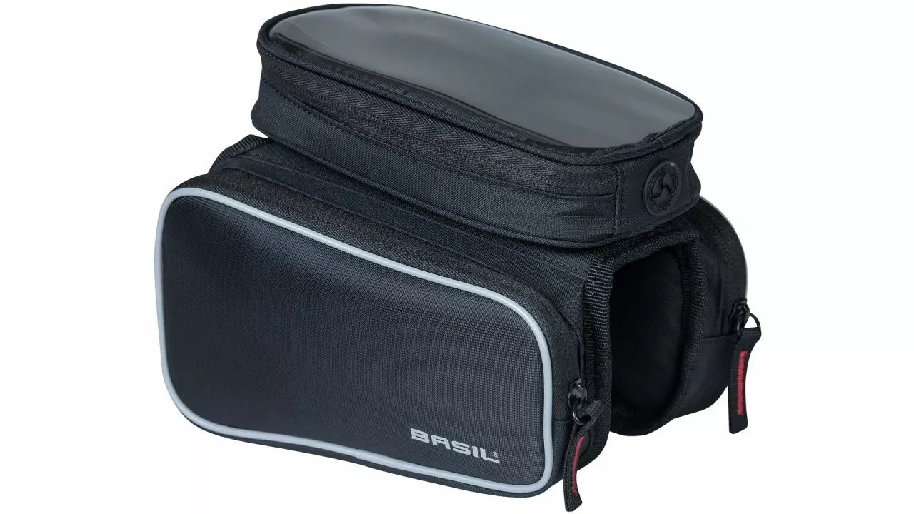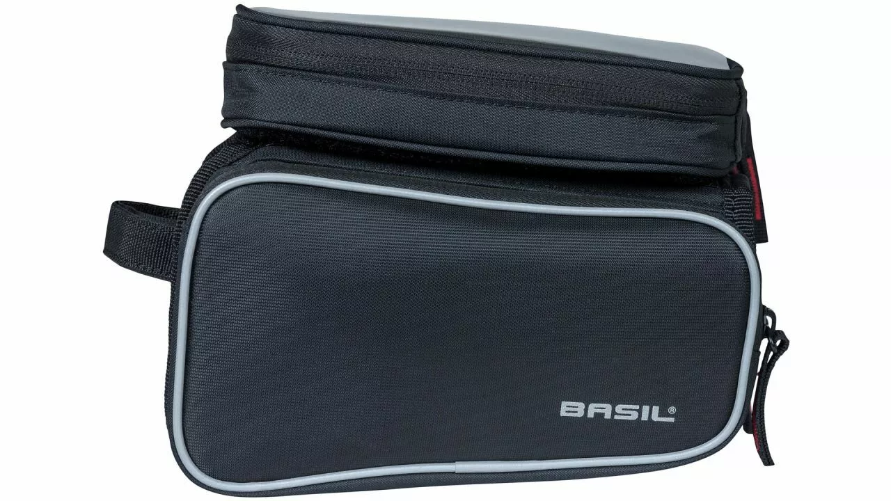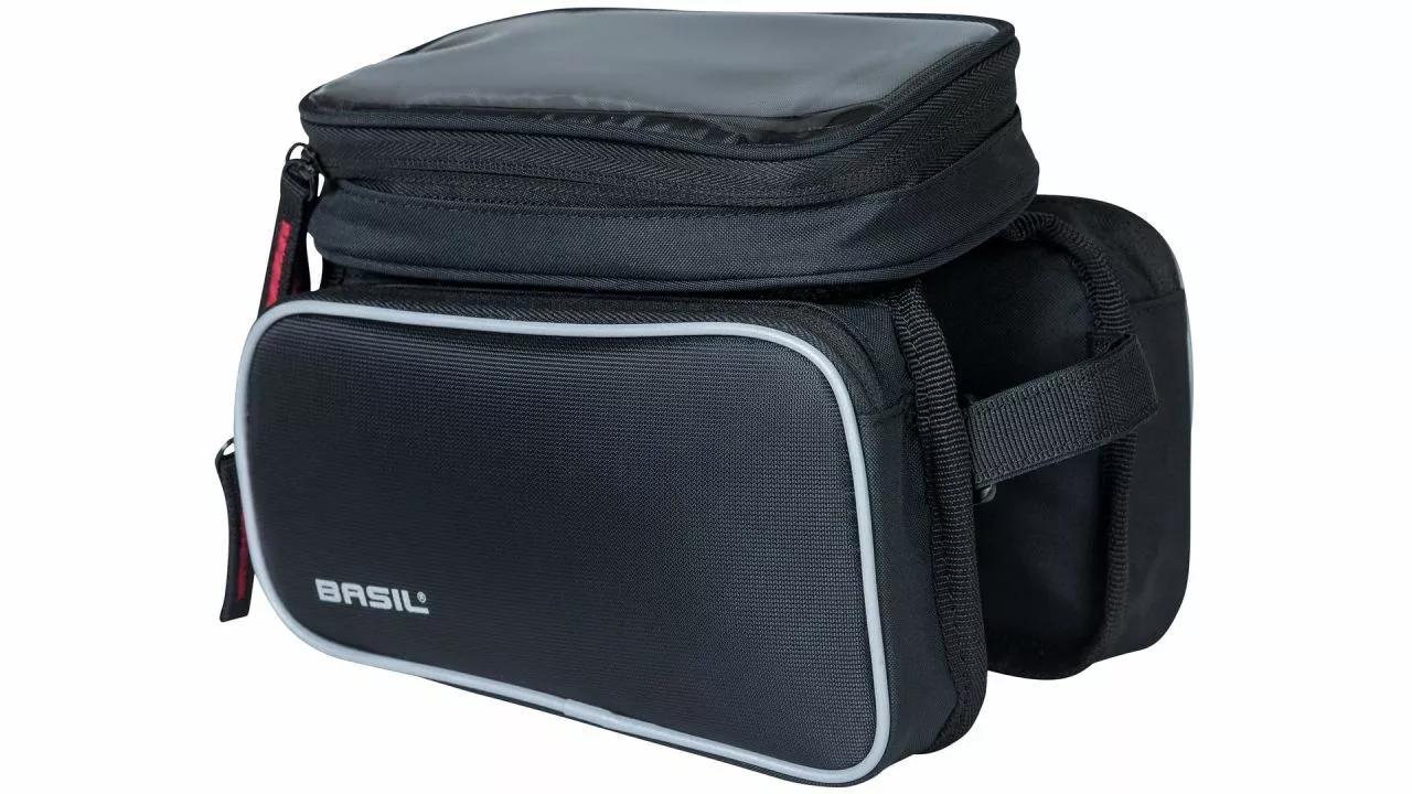 Die praktische Rahmentasche Sport Design Doppel von BASIL verfügt über zwei Seitentaschen mit Innennetzfach und einer abnehmbaren Deckeltasche. Dort findet das Smartphone seinen Platz. Die Deckeltasche verfügt nämlich über eine Klarsichtfolie, über die sich das Smartphone bedienen lässt, und einer Öffnung für Kopfhörer. <br><br>Mit einem Volumen von 1,5 Litern können in der Rahmentasche Kleinteile des alltäglichen Bedarfs wie Schlüssel und Taschentücher verstaut werden. Mit einem Klettverschluss wird die wasserabweisende Tasche am Oberrohr des Rades befestigt. Reflektierende Elemente machen einen bei Dunkelheit sichtbarer im Straßenverkehr.