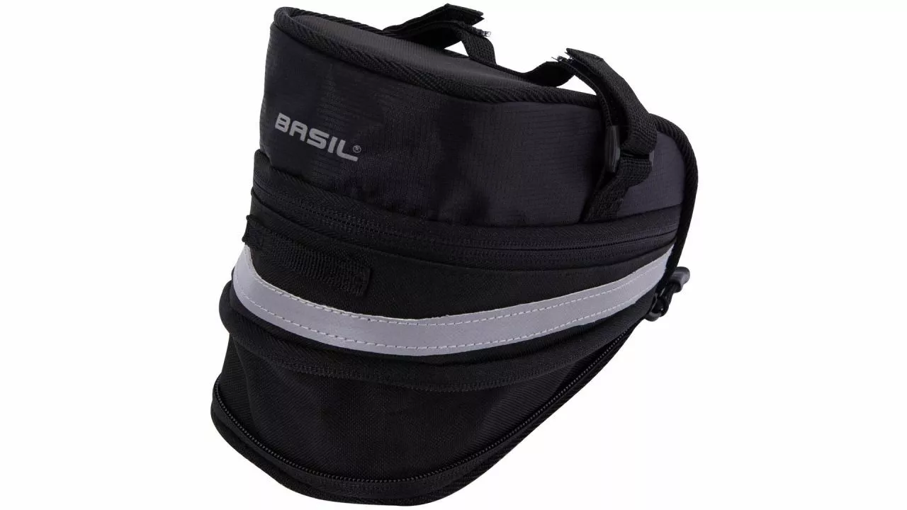 Bei der Mada von BASIL handelt es sich um eine schwarze Satteltasche in einer sportlichen und trendigen Ausführung. Die Satteltasche ist eine optimale Lösung für Fahrradliebhaber und das Verstauen eines Reifenreparatursets.<br><br>Wer gerne in der Natur Rad fährt, für den wird sich diese Satteltasche als unentbehrlich herausstellen. Mit einem Inhalt von einem Liter ist die Tasche perfekt, um Fahrradwerkzeug unterzubringen. Das ist sehr praktisch, wenn man unterwegs einen platten Reifen bekommt. Die Praktikabilität gilt natürlich auch für die tägliche Fahrradfahrt zur Arbeit. Dank des Extra-Vergrößerungsfachs lässt sich noch einiges mehr an Fahrrad-Accessoires mitnehmen. <br><br>Die Satteltasche ist aus wasserabweisendem 660D Polyester gefertigt und somit spritzwasserdicht. Man befestigt sie mit Hilfe von Klettverschluss und Clipverschlüssen am Sattel. Der Reflektorstreifen sorgt dafür, dass man auch abends gut für andere Verkehrsteilnehmer sichtbar ist. Trotzdem sollte man natürlich stets an angemessene Fahrradbeleuchtung denken. <br><br>Wer sich eine qualitative und trendige Satteltasche für den Sattel seines Fahrrads wünscht, findet in der BASIL Mada das genau Richtige für sich.