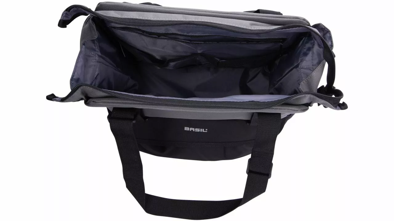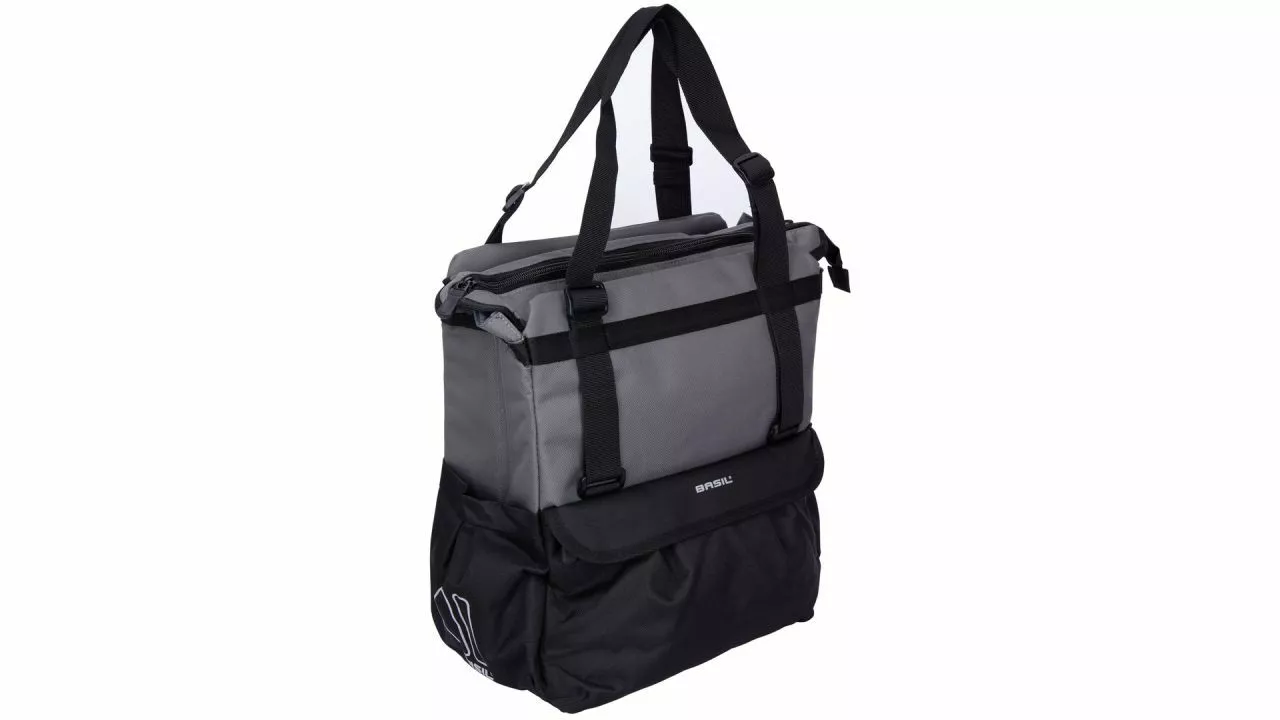 Bei der BASIL Shopper XL handelt es sich um eine sportliche und trendige Fahrradtasche, die sich mit Hilfe des BASIL Hook-On-Systems am Gepäckträger befestigen lässt. Diese geräumige Einkaufstasche ist in der Farbe Schwarz erhältlich. Sie ist für den Supermarkt- oder Wochenmarktbesuch besonders praktisch. <br><br>Die Tasche besitzt ein großes Vor- sowie Innenfach und verfügt darüber hinaus auch über Reißverschluss- und Seitenfächer. Weiterhin sind Flaschenbänder vorhanden: Ideal, wenn man seine Flaschen gerne aufrecht transportieren will.<br>Der Gesamtinhalt des BASIL Shopper XL beträgt 20 l. Nicht nur für das Einkaufen bietet sich die Tasche an. Man kann mit ihr ebenfalls gut zum Strand oder zu einem Erholungsgebiet fahren.<br><br>Dieser Shopper ist aus wasserabweisendem Polyester gefertigt. Die verstellbaren Trageriemen erlauben die Umwandlung zu Schulterbändern. Beide Seiten der Fahrradtasche sind außerdem mit Reflektoren versehen. Damit ist man in der Dunkelheit gut für andere Verkehrsteilnehmer sichtbar.<br>Im Reißverschlussfach des BASIl Shopper XL befinden sich Fahrradhaken zum Befestigen am Gepäckträger.
