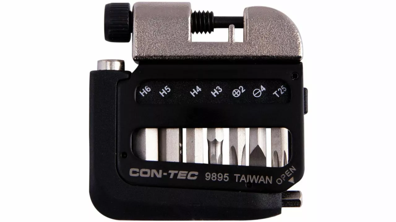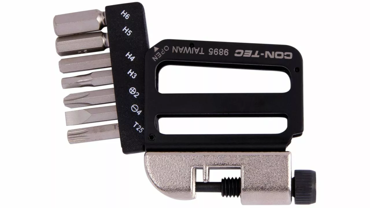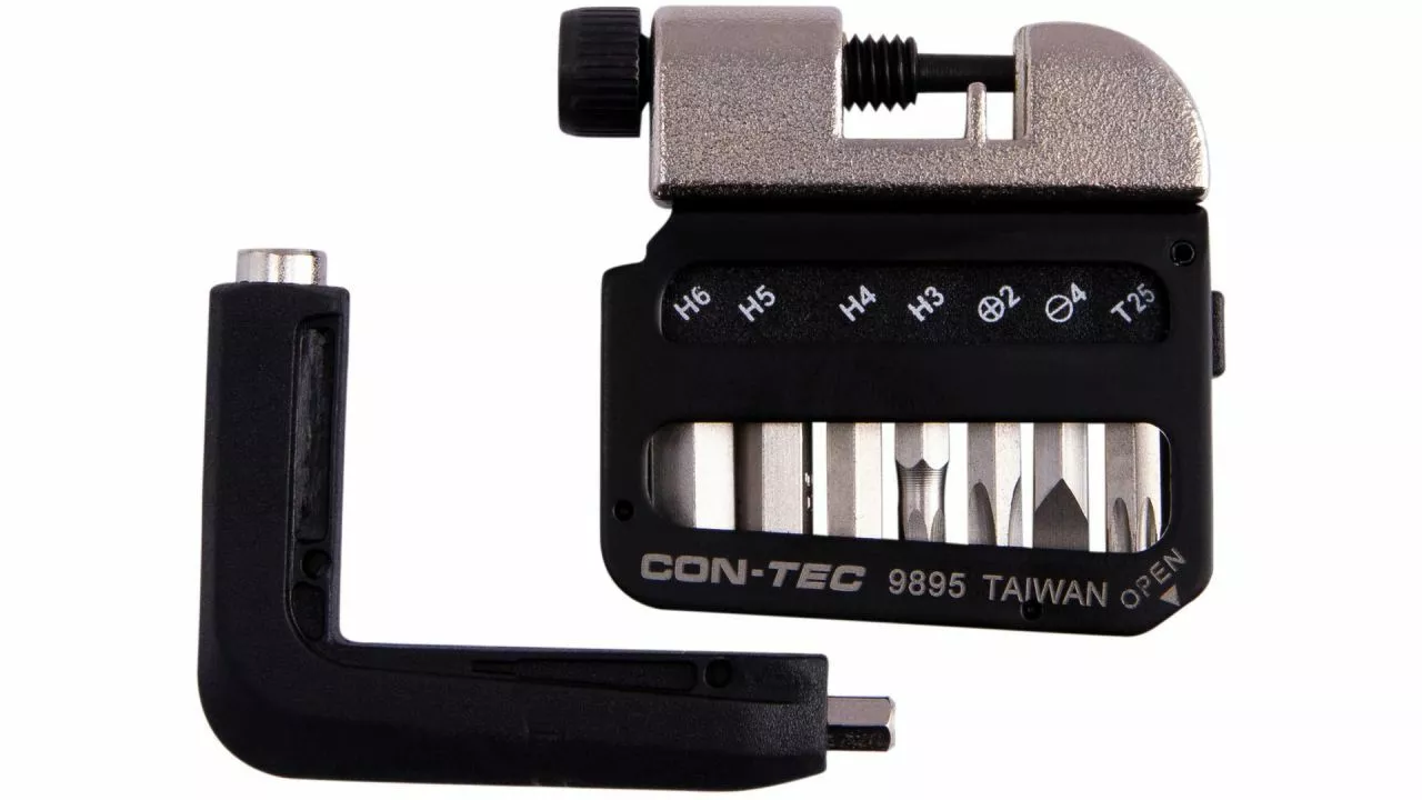 Werkzeug für das Fahrrad darf besonders auf längeren Touren nicht fehlen. Das CONTEC Multifunktionswerkzeug Pocket Gadget – PG1 passt dank seines flachen und kompakten Designs in jede Tasche und steht immer direkt zur Verfügung. Es wiegt nur 102,5 g, wartet aber mit satten 8 Funktionen auf, darunter 3/4/5/6 mm Innensechskantschlüssel, Schlitz- und Kreuzschraubendreher, Innensechsrund-Schlüssel T25 sowie ein Kettennietdrücker. Mit diesem Multitool sind Profis und Hobbyfahrer jederzeit gut ausgestattet.