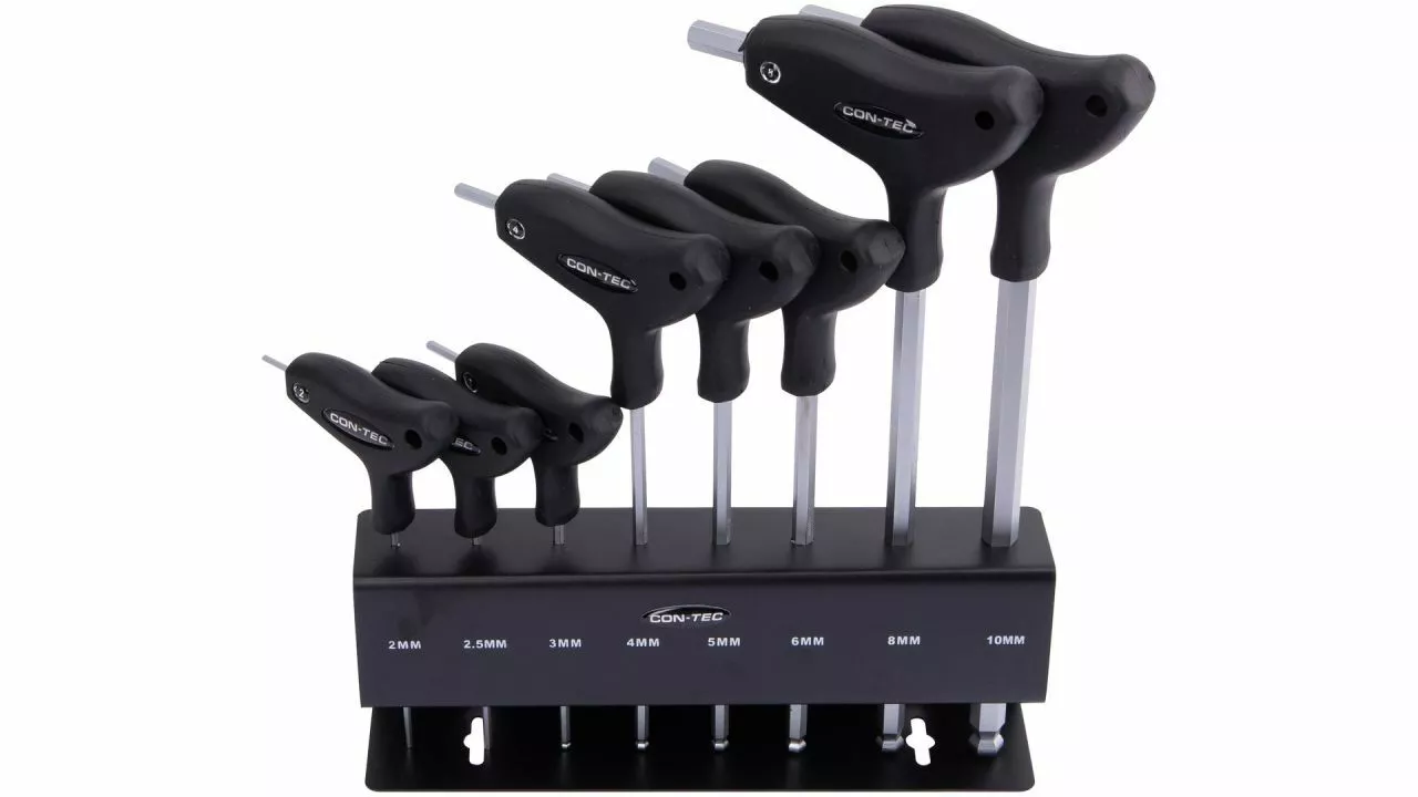 Ohne das passende Werkzeug kommt kaum ein Radfahrer aus. Mit dem 8-teiligen CONTEC Innensechskant-Schlüsselsatz sind Profis und Hobby-Fahrradfahrer jederzeit optimal ausgestattet. Die enthaltenen Sechskantschlüssel zeichnen sich durch ein ergonomisches Design aus, das bei jedem Arbeitsschritt einen optimalen Griff und Halt ermöglicht. <br><br>Verwendet werden können die einzelnen Schlüssel als T-Schlüssel mit Kugelkopf am unteren Drehmomentende sowie als L-förmiger Schlüssel für hohe Anzugsmomente. Auch eine praktische Wandhalterung ist inklusive.