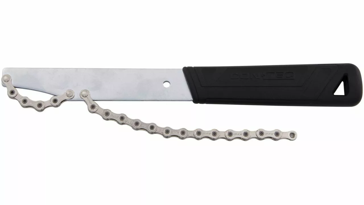 Die Kettenpeitsche TFP-100 von CONTEC kommt zum Einsatz, wenn eine Shimano HG-Kassette demontiert werden soll. Er ist als Gegenhalter notwendig, damit die Kassette im Freilauf nicht weiterdreht, wenn der Verschlussring einer HG-Kassette von Shimano zum Beispiel mit dem Zahnkranzabzieher -Werkzeug TFP-110 geöffnet wird. <br><br>Das Werkzeug der Tools for professionals-Reihe von CONTEC ist aus Stahl gefertigt, verfügt über einen ergonomischen Griffteil, sein Kettenpeitschenteil ist kompatibel mit Kassetten von 5 bis 11 Ritzeln.