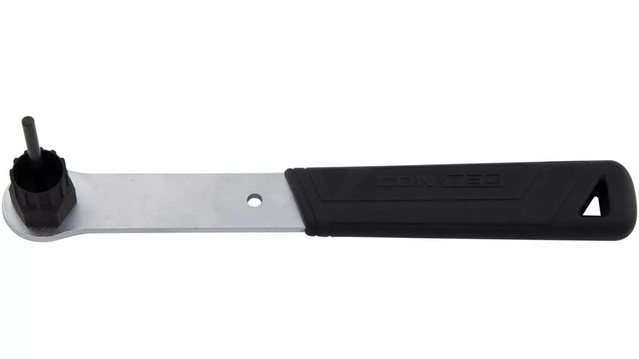 Mit dem TFP-110 von CONTEC lassen sich die Verschlussringe für HG-Kassetten und Center Lock Bremsscheiben wahlweise öffnen oder festziehen. Es besteht aus Stahl und verfügt über einen ergonomisch geformten und gummierten Griff. Als Gegenhalter passt dazu die Kettenpeitsche TFP-100.