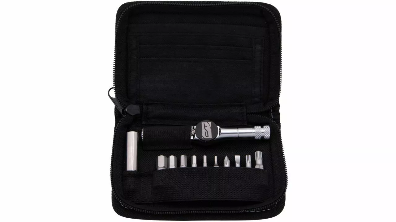 Das TFR Trident Ratchet ist ein vielseitiges Steckschlüssel-Ratschen-Set für ¼'' Bits. Durch Umstecken der einzelnen Teile lässt sich das Set als T-Schlüssel verwenden; und auch in beide Richtungen, dank der Umschaltfunktion. Inklusive Verlängerung und Tasche. <br><br>Die zehn Schlüssel aus Chrom-Vanadium-Werkzeugstahl sind: 2,5; 3; 4; 5; 6 und 8 mm Innensechskantschlüssel; T25 und T30 Innensechsrund-Schlüssel sowie PH1 Kreuzschlitzschraubendreher.