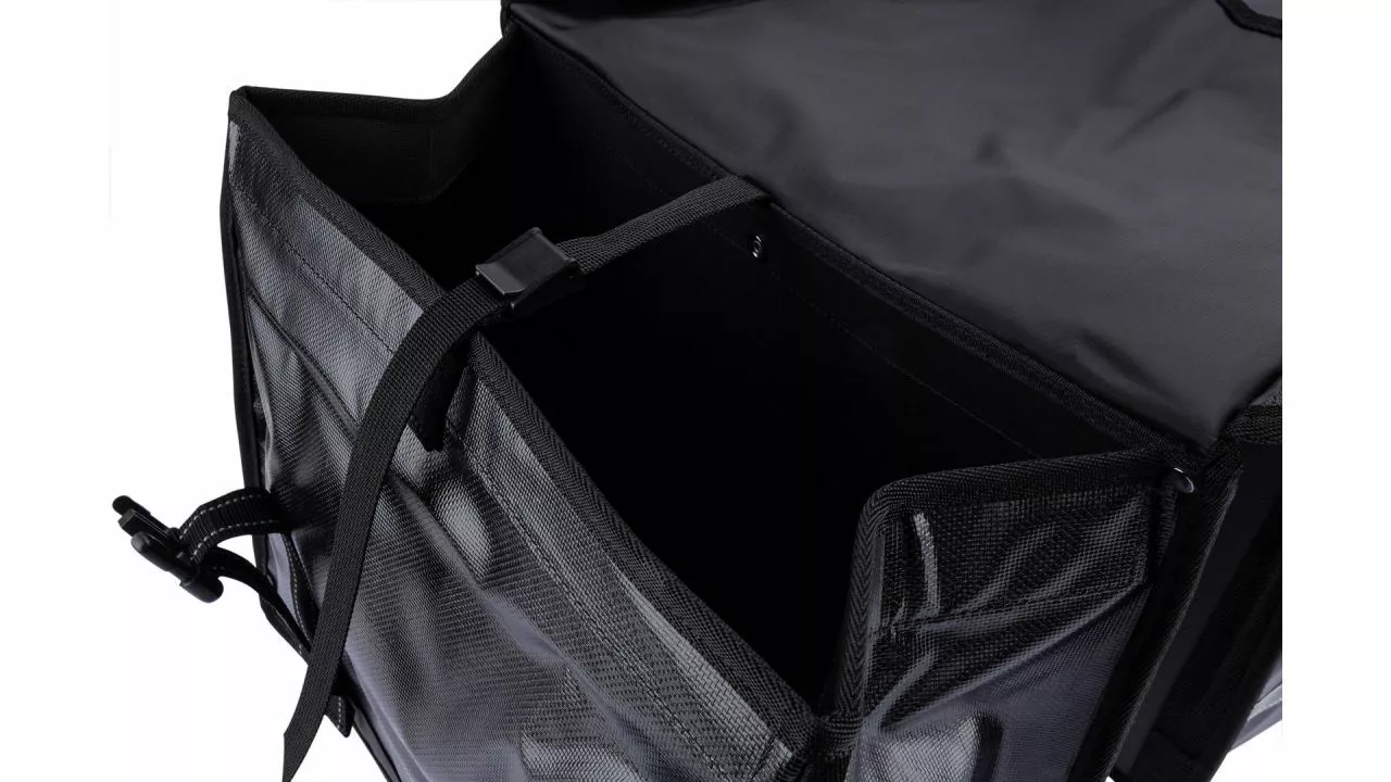 Diese robuste, doppelte Fahrradtasche besteht aus wasserabweisendem Bisonyl. Sie ist auch dank ihrer doppelten Nähte besonders stabil. <br>Um die Sicherheit im Dunkeln zu erhöhen, verfügt die Tasche außerdem über Reflektoren. Sie lässt sich über einen Klickschnallenverschluss leicht öffnen und schließen.