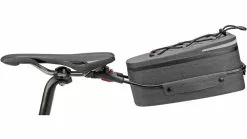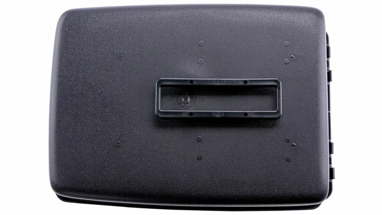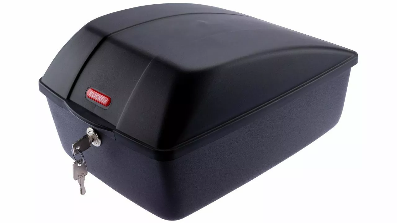 Die Box von RIXEN & KAUL für den Gepäckträger ist eine schlanke Hartschalenbox mit Schloss und robuster Oberfläche. Im Innern bietet sie, vor Regen geschützt, Platz etwa für einen Helm oder kleines Gepäck. Sie wird mit dem jeweiligen Adapter fest auf den Gepäckträger geklickt und trägt Lasten bis 12 kg.